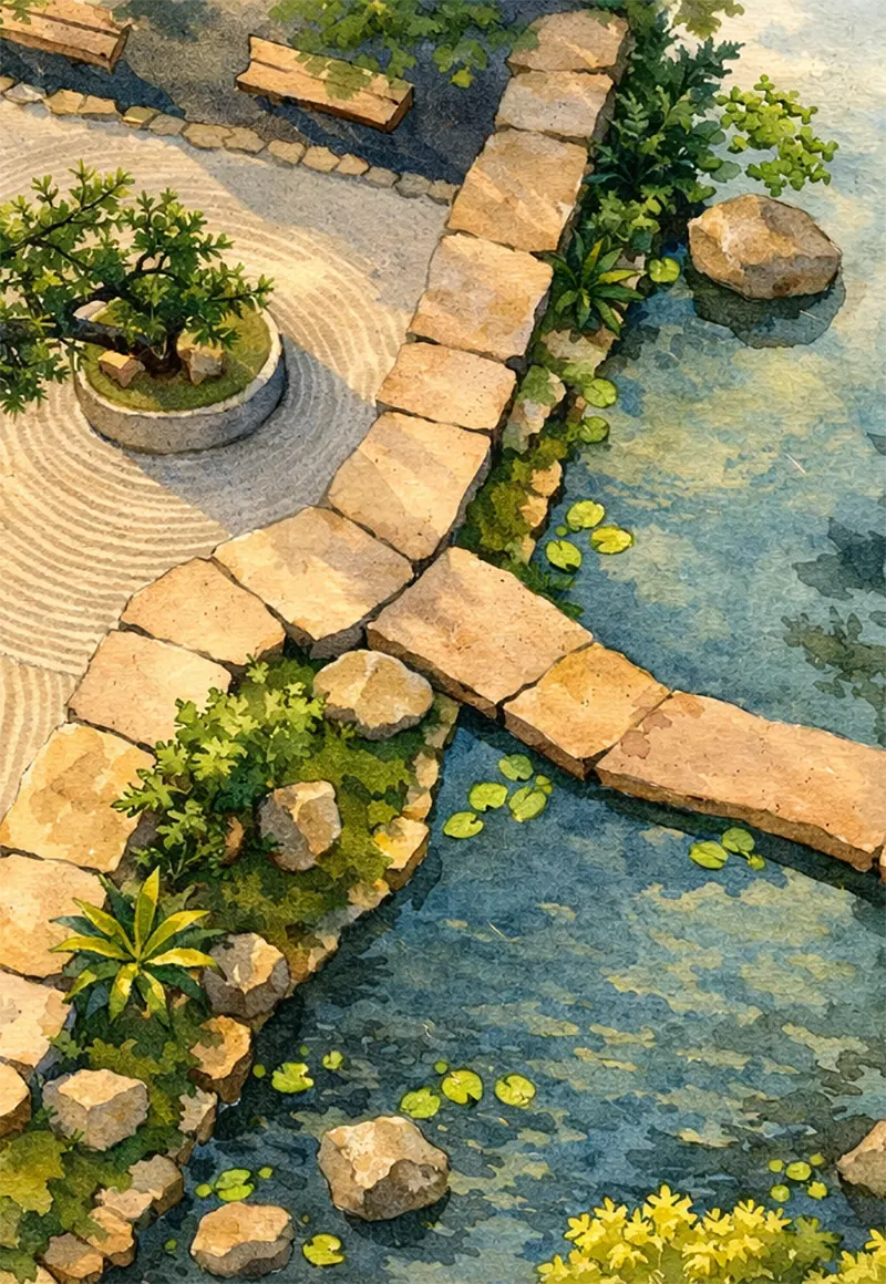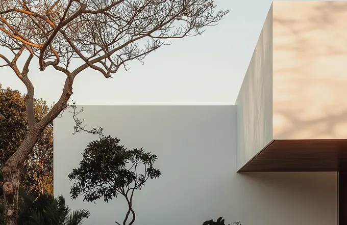 Facades flow organically, evoking a sense of continuity between indoor and outdoor spaces, while washed-white exteriors create a striking contrast with the vibrant gardens and water features that surround them. Minimalist bridges elegantly extend between buildings, seamlessly linking the community while allowing cars to move effortlessly, ensuring safe, serene circulation for pedestrians.