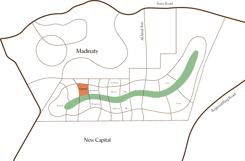 Cityzen enjoys a prime location overlooking the iconic Mostakbal Boulevard and the vibrant Commercial Strip, surrounded by premium residential compounds in every direction. Seamlessly connected to Mostakbal City's main gate via the E-Ring Road, it offers effortless access to the city's key attractions in a heartbeat.